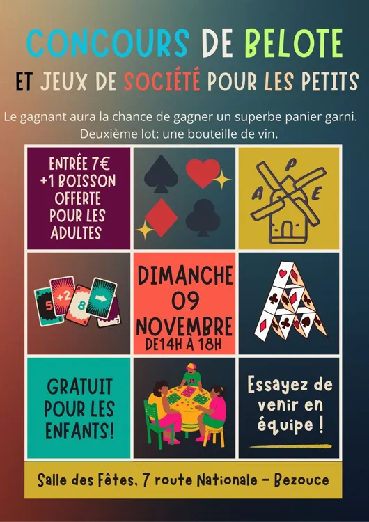 Concours de Belote pour les adultes et jeux et activités pour les enfants.