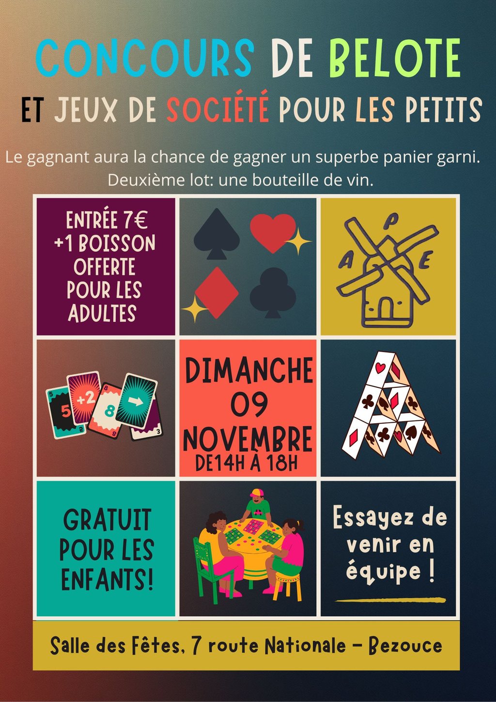 Concours de Belote pour les adultes et jeux et activités pour les enfants.